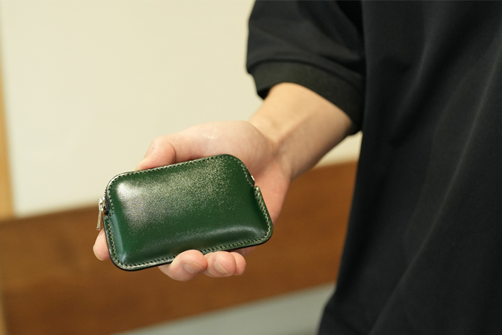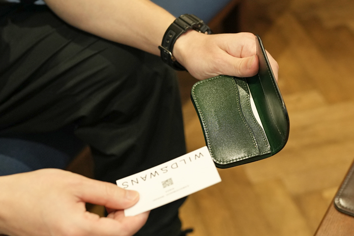 曲線を描くコバが特徴的な名刺入れ。メイン収納部のマチが伸縮することにより、50枚ほどの名刺を収納することができます。プラスチックカードを収納して日常使いしていただくのもおすすめです。