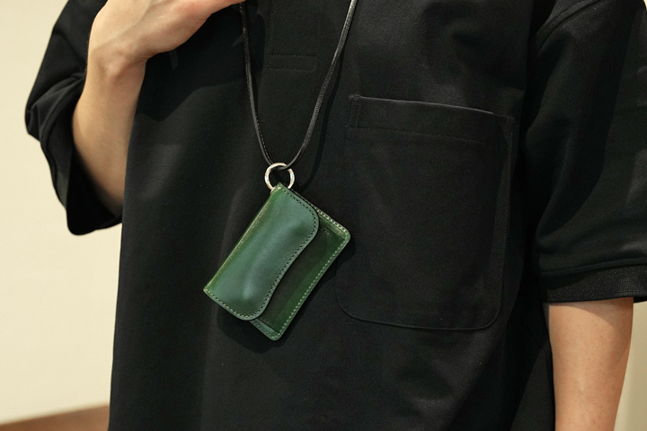 コインケースTONGUEにハトメが付いたモデル。3つ折りのお札を収納すれば最小の財布として使用することができ、さらにネックストラップを使用することで鞄を持たずにお出かけすることもできそうです。