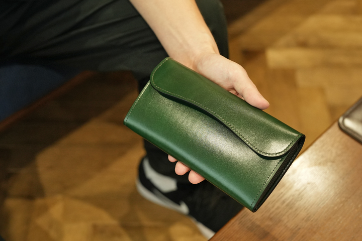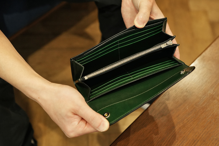 収納力をお求めの方におすすめの長財布。収納部がすべて上側に向かって開いているので、扱いやすさや見やすさにも優れています。大きな板面を使用した外装は革の表情を存分に味わうことができ、エイジングを楽しむこともできます。