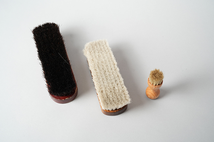 WILDSWANSで使用するブラシは馬毛ブラシ、山羊毛ブラシ、コバブラシの主に3つです。同じブラシでも汚れ落としや磨き、仕上げなどいくつかの用途があります。WILDSWANSでは、用途によって次のような使い分けをしています。