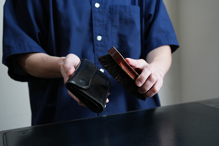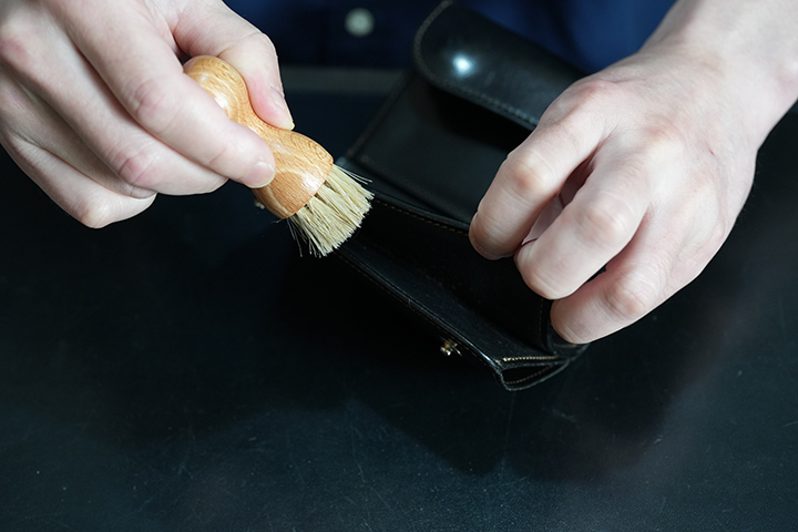 お使いのWILDSWANS製品をより良い状態でお使い頂くための基本的なお手入れとして、先ず初めに行うのはブラッシングと乾拭きです。こちらを1ヶ月に一度程度して頂くことで、曇りの原因になる汚れを除去して製品をキレイな状態に保ちます。ブラッシングと乾拭きはメンテナンスの基本中の基本となりますが、小型の財布一つでしたら平均所要時間は2分程度ですので、是非お試しください。