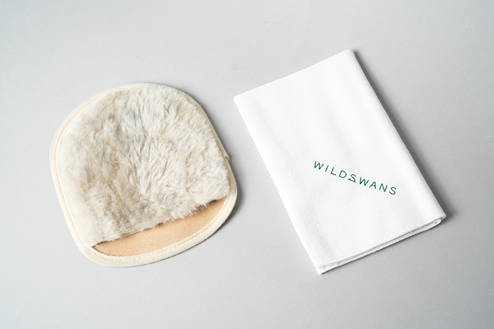 乾拭きは摩擦により皮革表面の曇りを除去したり、皮革内部の油分やクリームを馴染ませるために行うお手入れです。WILDSWANSでは乾拭きに次の二つのアイテムを使用しています。