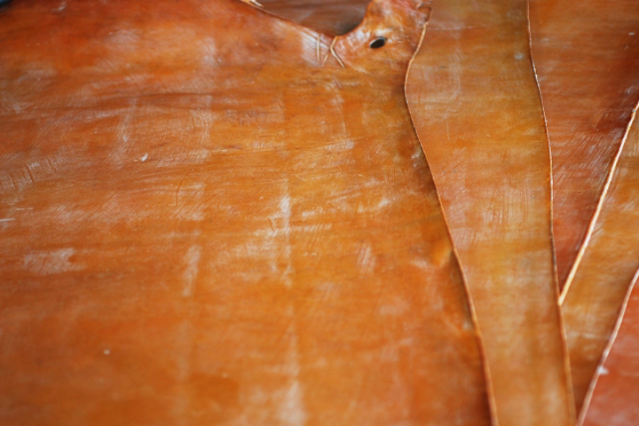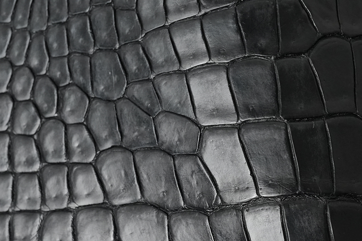 至高のレザーアイテムの製作には最高級の素材が必要ですが、先ずはこちらの素材のご紹介からさせて頂きます。今回のシリーズでメイン素材として製作に使用する皮革は、イギリス・ベイカー社が特別に生産するベイカーオークバークポロサスです。WILDSWANSでは、フルグレインブライドルレザーでお馴染みのベイカー社。某大手メゾンから支給された特別なポロサスをオークバーク(楢の樹皮)から抽出したタンニン溶液を用いるベイカー社秘伝のレシピによりじっくり鞣していきます。一般的に、ポロサス(上の画像2枚目)は4種あるクロコダイルの中で最も高級とされるレザーですが、ここでポイントとなるのは「某大手メゾンから支給された特別なポロサス」という部分となり、端的に言えば「普通のポロサスではない」ということになります。一体何が違うのか。その答えは、このベイカーオークバークポロサスの鱗(斑)に現れています。鱗を拡大した上の画像3枚目をご覧ください。通常のポロサスあるいはクロコダイルと比べるとベイカーオークバークポロサスの鱗は、より立体的でふっくらとした上品な形状をしています。また、製造時に使用するロウ分などの影響からなのか、その光沢は少しマットでスモーキーな雰囲気があることも特徴です。こうしたポロサスが供給されるのは一部の大手メゾンに限られるため、普段ですと中々お目にかかれるものではありません。