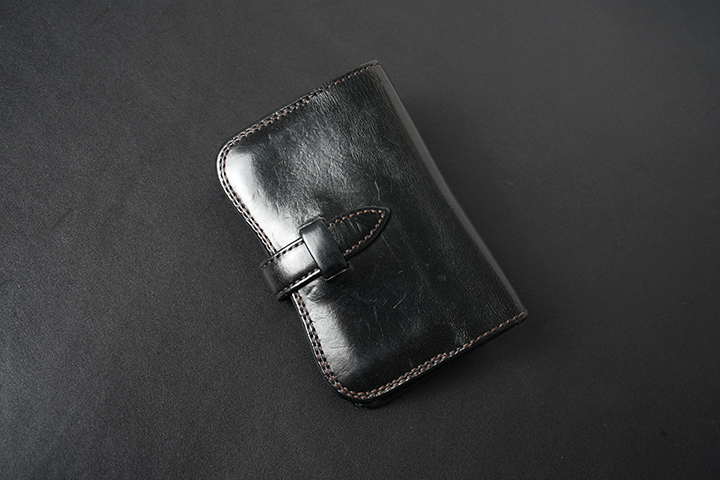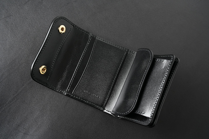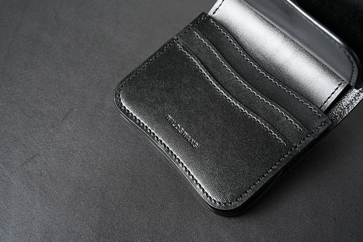 内装には、WILDSWANS製品の製作には欠かせないサドルプルアップを組み合わせました。メイン素材に合わせてサドルプルアップ、さらに縫製についても同色のブラックを採用することで、製品としての統一感を強く意識しました。サドルプルアップを生産するベルギーのマシュア社も皮革業界では一目を置かれる存在です。なぜならサドルプルアップに用いられる分厚い牛の原皮を鞣すことができるタンナーは、マシュア社など世界でもほんの一握りしか存在しないからです。こうした優れた技術は、高い耐久性が要求される馬具に対応するため開発されましたが、驚くべきことに150年以上前にはこうした技術で馬具の生産をしていたそうです。サドルプルアップもタンニン鞣しの皮革ならではの美しい艶を伴うエイジングが特徴ですが、実用面においては内装に用いることで製品に頑強な軸を形成します。上の画像2枚目ではスタッフが10年使用した名刺入れ・サドルプルアップSTING(廃番)のブラックを掲載しています。所々に経年のキズは見られますが、10年使用したとは思えないほど皮革のハリ感は損なわれていません。
