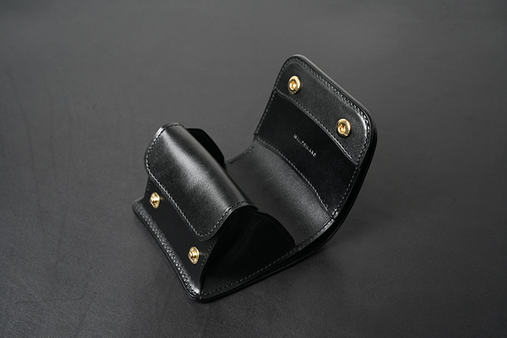 WILDSWANS初製作となるブラックのベイカーオークバークポロサスを使用した特別なシリーズでは、合計11アイテムのラインアップにてご用意しました。非常に貴重な皮革であることから各アイテムの製作数はいずれも数点に留まりますが、すべてのアイテムにおいて、この希少性の高い皮革を十分に堪能頂ける仕上がりとなりました。ご紹介しておりますベイカーオークバークポロサスを用いた至高のアイテムの数々は、8月17日昼12:00よりWILDSWANSの直営店であるWILDSWANS銀座店とWILDSWANS Online Shopにて一斉に発売させて頂きます。各アイテムの詳細や各店の販売方法については、この後ご紹介させて頂きます。