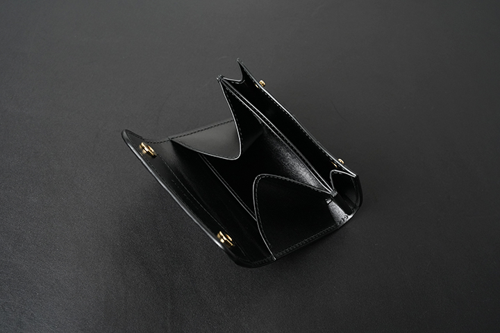 定番の二つ折り財布もベイカーオークバークポロサスにより、新たな一面を覗かせます。比較的コンパクトなアイテムですが、ベイカーオークバークポロサスの外装を開いた様子は圧巻の一言です。内装は外装とは異なる艶を持つサドルプルアップのブラックが一面に使用されています。