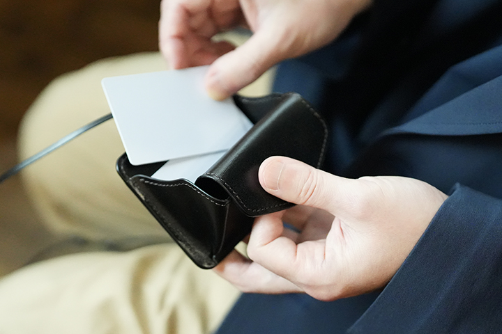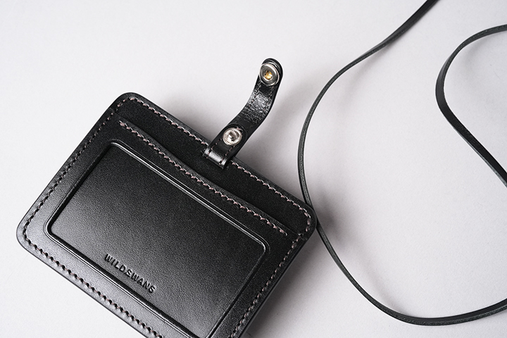 メイン素材には、WILDSWANSがブランド設立当初から製作に使用するベルギー牛革のサドルプルアップを使用しています。PVC(ポリ塩化ビニル)製のIDホルダーとは異なり、革の温もりやエイジングが楽めることはもちろんのこと、修理などのアフターサービスにも対応していることから、長く使用できて環境にも配慮されたIDホルダーウォレットです。本体の表側は窓枠付きのIDケースとなり、こちらの上部には首から下げて使用できるようにサドルプルアップ製のストラップも付属しています。また、IDケースの背面にはコインや折り畳んだ紙幣が収納できるフラップ付きのポケットも備えていますが、こちらはミニウォレットとしても機能することから、そのままランチへ直行することもできます。都内のランチでも現金のみの支払いに限定した飲食店をちらほら見かけますので、そんなシーンでも重宝するアイテムです。さらにポケットのフラップを前方に引っ張るとフラップの背面にスペースができますので、こちらにカードや名刺を収納することも可能です。革の温もりが心地よいIDホルダーケースのVERITEはWILDSWANSの直営店である、銀座のWILDSWANS support&galleryとWILDSWANS Online Shopで販売中です。なお、こちらのモデルの詳細については、この後ご紹介させて頂きます。