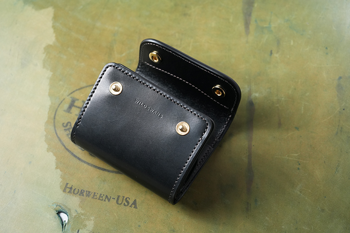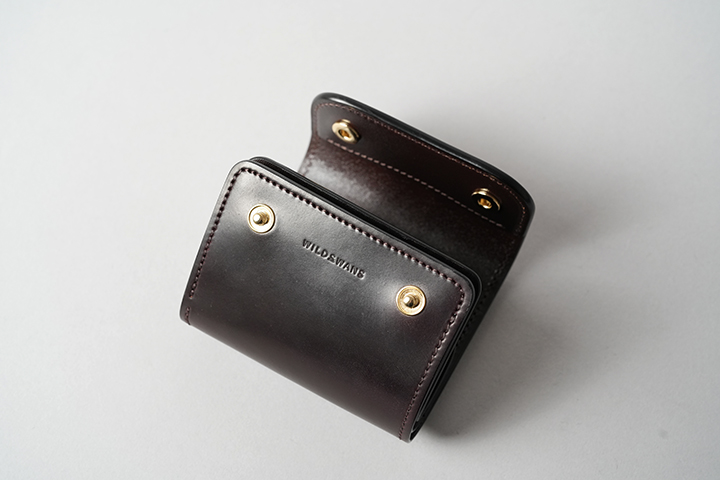 創業から100年以上の歴史を持つ北米で最も有名なタンナーのホーウィン社。シェルコードバンは、ホーウィン社が生産する皮革のなかでもとりわけ人気があります。シェルコードバンの原材料となる馬の臀部は、牛革などに比べると採取できる面積が非常に限られているため、希少価値の高い皮革としても知られています。その一方で近年は良質な原皮の確保や労働力の確保が以前に比べて困難となっていることから、より希少価値が高くなっているようです。ENOminiは先代モデルのENOが持つ親しみ溢れるボディを継承しながらも、現代にフィットしたサイズダウンを試みた意欲的なウォレットです。外装に革のダイヤモンドとも呼ばれるシェルコードバンを使用することで、小さなアイテムでありながらインパクトの強いアイテムに仕上がりました。エイジングしたシェルコードバンは強い光沢に加えて、しっとりとした手触りに変化します。より手に馴染むリッチな質感もお楽しみ頂けるシェルコードバンENOminiは、WILDSWANSの直営店である銀座のWILDSWANS support&galleryとWILDSWANS Online Shopで発売中です。なお、シェルコードバンENOminiの仕様などの詳細については、この後ご紹介させて頂きます。