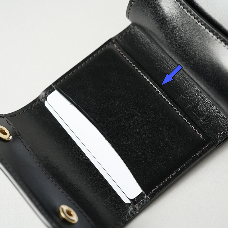 ENOminiの中央のカードポケットについて、コインケース側に空いたスペースは構造上非常にタイトなスペースとなりますので、カードの収納はお控えください。(青い矢印のスペースです。)