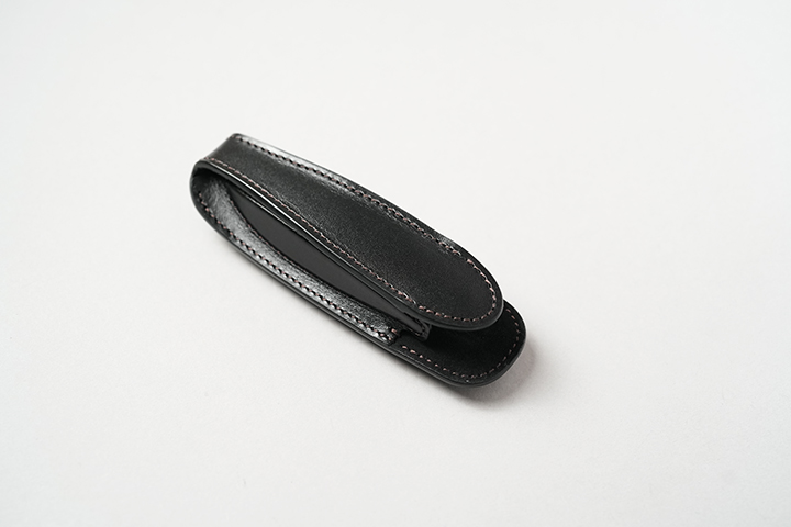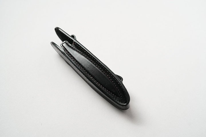 外装の4面にはそれぞれ芯材を入れています。こちらの目的として、外部からの衝撃から収納したソムリエナイフをしっかりと保護すると共に、長年の使用にも耐え得るように形が崩れにくい仕様にしていること。さらに、様々な形状のソムリエナイフに対応するため、フラップがない形状でもホールド力を高める目的もあります。また、側面には職人が丁寧に磨きをかけたWILDSWANSならではのコバ(革の裁断面)が見られます。こちらは素磨きで仕上げることで移染が起こりにくい仕様です。