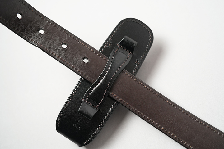 背面には当て革により3つのループ(輪)を形成しています。中央のループはベルトが通せるように他のループよりも大きなループです。上下2つのループはWILDSWANSのカラビナキーリングMに対応しています。例えば上のループにカラビナキーリングMを付けて、パンツのベルトループに装着することも可能です。あるいはWILDSWANSのショルダーストラップ・SADDLE PULL UP / TETHERとカラビナキーリングMを連結することで、首から下げて使用することも可能です(上の画像ではショートサイズを使用)。