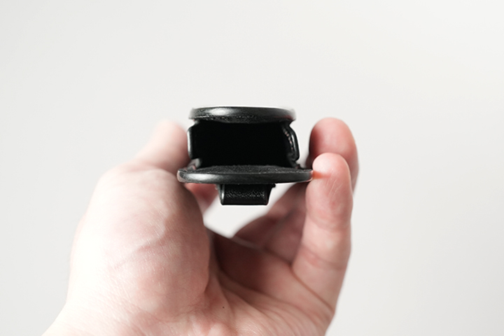 側面を支える両側のパーツは、挿入部が僅かに外側に開いた状態となります。この花びらのような形状は収納するソムリエナイフを内部に誘導しやすく、手探りでもスムーズに収納できるように工夫されています。店内が暗い場合でもスピーディーで品位のある振る舞いが求められるソムリエの仕事をフォローします。なお、内装の前身側と背面側にはスエード革、両側に型押し革をそれぞれあしらうことで、収納したソムリエナイフをしっかりグリップします。