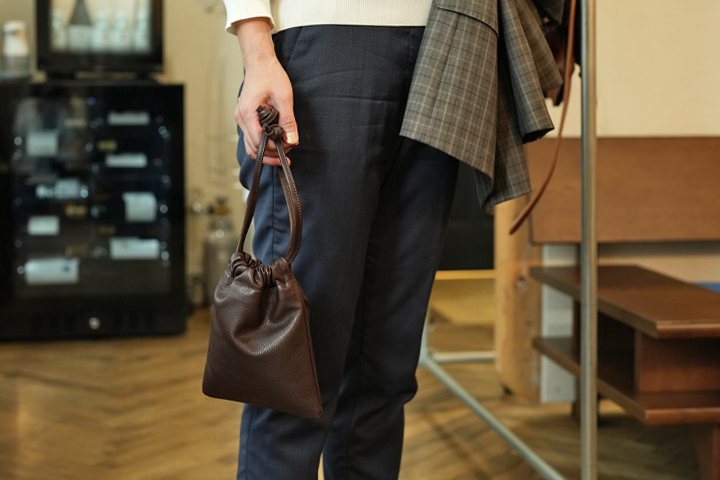 BOURSE(ブレス)、BOURSE(L)(ブレスL)は外装にラスティカーフ、内装にマイクロスウェードを使用したレザー製の巾着です。