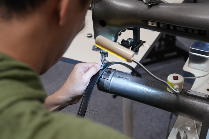 ショルダーストラップは表にサドルプルアップ、裏面にノボナッパを使用し、肉厚で強靭に仕上げています。長さ調整にはギボシを採用し、5cm間隔で5段階の調整が可能です。 ショルダーストラップは足踏みミシンで一目一目丁寧に縫製を行っていますが、表側のサドルプルアップに縫製の前段階でステッチ穴を開けておくことで、糸が締まりやすく、ステッチもより均一で美しくなるようひと工夫をしています。