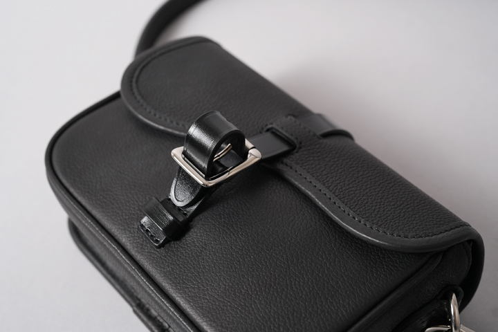実は本体バッグのフラップのベルトと、サイドのDカンを止めるパーツにはサドルプルアップを用いてショルダーストラップの要素を取り入れています。 随所にクラシカルな要素や無骨さが取り入れられていますが、全てがバランスよく合わさることで、上品にもカジュアルにも表情を変えるアイテムに仕上がりました。