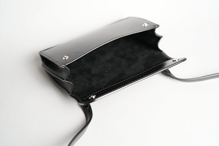 フラップの内側には、WILDSWANSのお財布などでも使用されるシルバーカラーのホックが左右に1点ずつ配置されます。フラップを閉めるたびに奏でる小気味の良い金属音からも、WILDSWANSらしさが十分に伝わってきます。また、フラップの内側の中央には、WILDSWANSのロゴが刻印されています。縫製の大部分は足踏みミシンで仕上げていますが、前身とマチを繋ぐ縫製やショルダーストラップなどの縫製の一部は手縫いにより仕上げています。いずれも熟練した職人の技術が必要不可欠なポイントです。メイン収納部は、内ポケットなどが一切付かない一室構造です。こちらの内装には上質な手触りのキッドスエードがあしらわれ、外装のサドルプルアップと共に収納したアイテムを優しく保護します。スマートフォン、財布、キーケースなどお出掛けに必要最小限のアイテムでしたら、余裕を持って収納ができます。