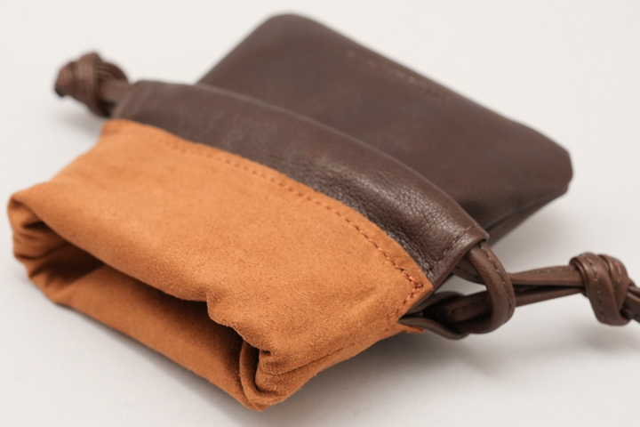 BOURSEは口元を革紐で閉じるドローストリングバッグで、細々としたものを収納可能なアイテムです。メイン素材のアノネイ社(TANNERIE D’ANNONAY)のラスティーカーフはしなやかで弾力のある質感と高級感のある表情が特長です。