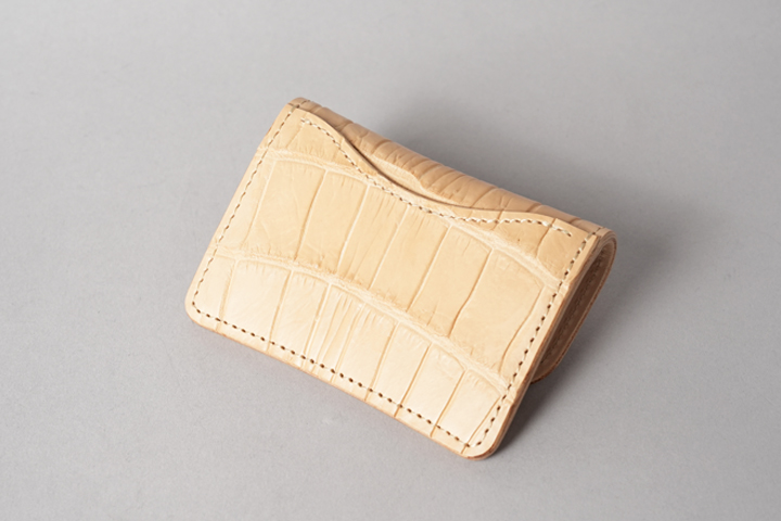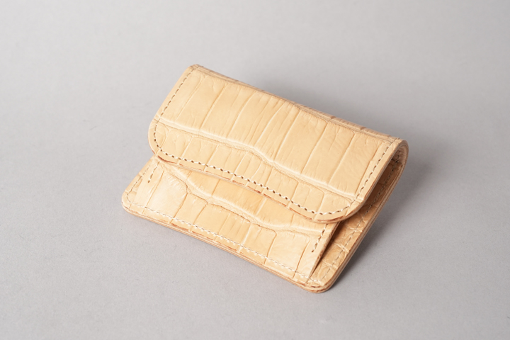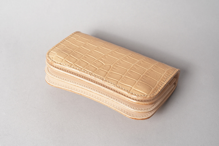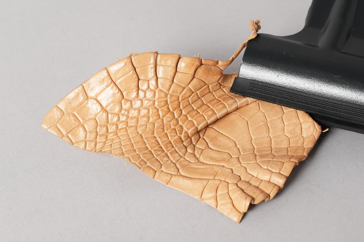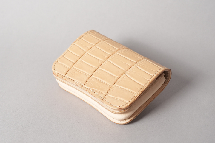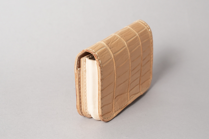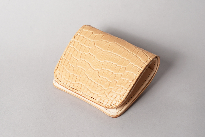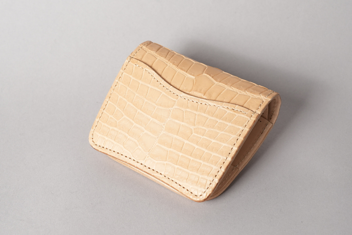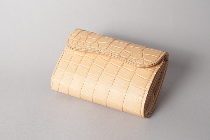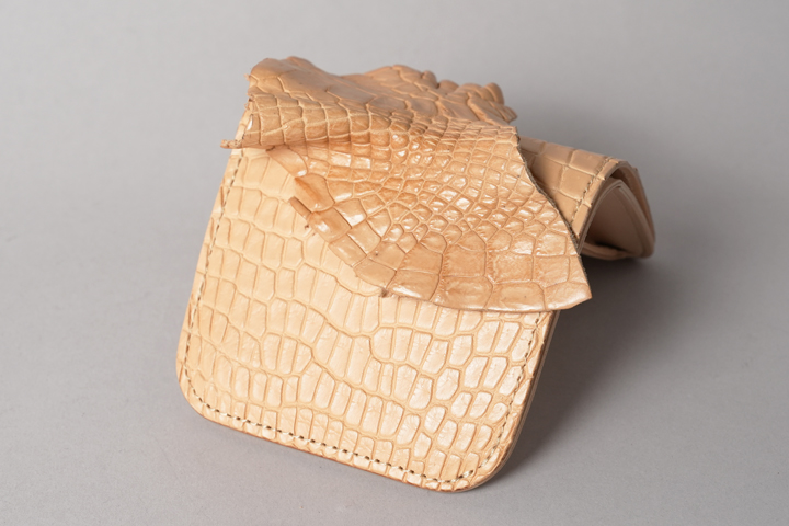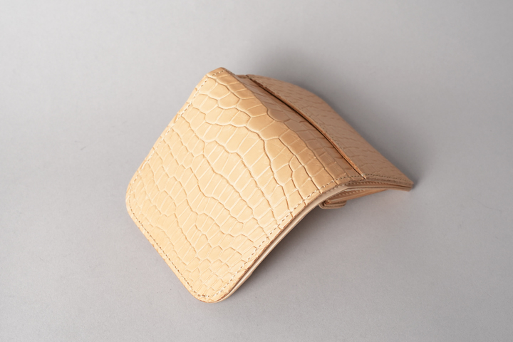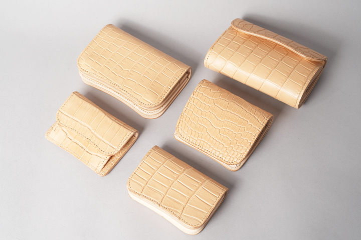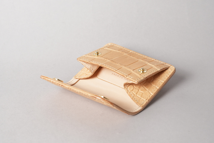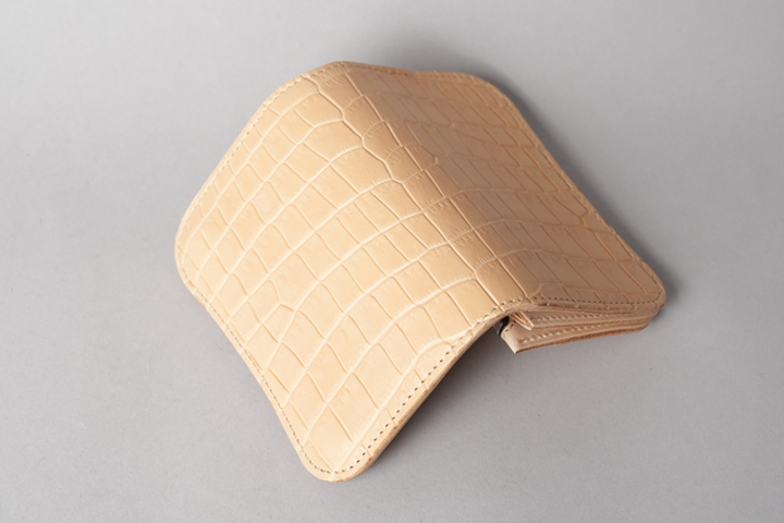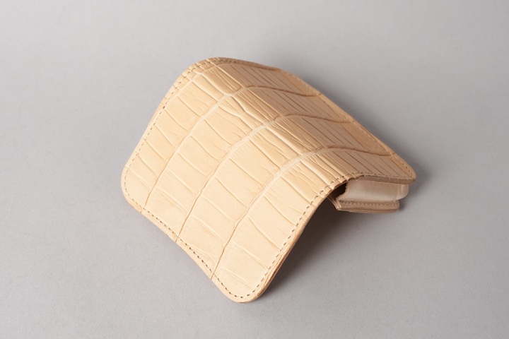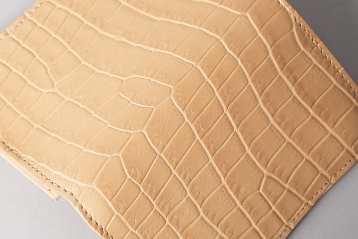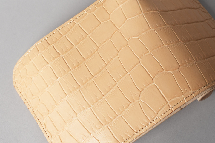 今回の受注会でメイン素材として使用する皮革は、HCP社が生産するヌメポロサスです。 HCP社はフランスとイタリアに拠点を置く世界最高峰のクロコダイル専門のタンナー(鞣し業者)です。エコフレンドリーに取り組む、環境に配慮した企業であることも有名です。 クロコダイルの中でも斑の並びの美しさや希少性から最高峰とされるポロサス(スモールクロコダイル)。WILDSWANSでもポロサスを用いた製品を度々販売させて頂きましたが、その鞣し方やカラーは、クロム鞣し、混合鞣し、ブライドル、墨染めなど多岐にわたります。 今回ご用意させて頂いたのは、一切の着色を施さず表面に艶出し加工も行っていない、非常にナチュラルな仕上がりのヌメポロサスです。環境に配慮するHCP社らしく、フルタンニンでじっくり丁寧に鞣されています。ヌメポロサスは艶出し加工を行っていないため若干マットな質感に仕上がっており、色は一般的なタンニン鞣し牛革を思わせるようなベージュ色です。