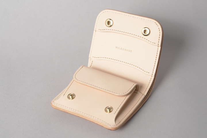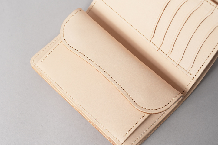 内装には定番素材である、サドルプルアップのナチュラルを組み合わせています。こちらもまた劇的なエイジングをするタンニン鞣し革となりますので、ヌメポロサスとの相性はピッタリと言えるでしょう。