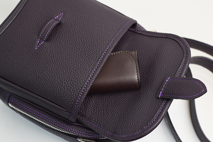 本体前面には、フラップ付きの外付けポケットが装備されており、こちらはキーケースや財布等の収納に適しています。