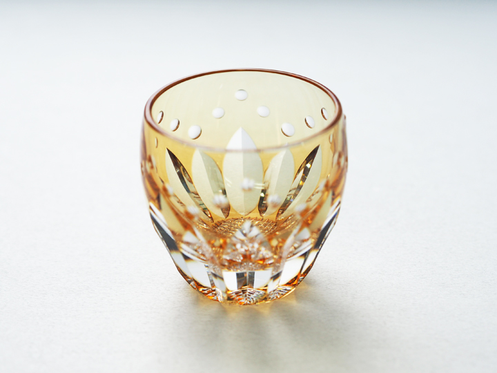 一方こちらは「向日葵」と命名された杯で、淡く透明感のある暖色と、側面上部に施された小さな水滴のような模様が印象的な杯です。