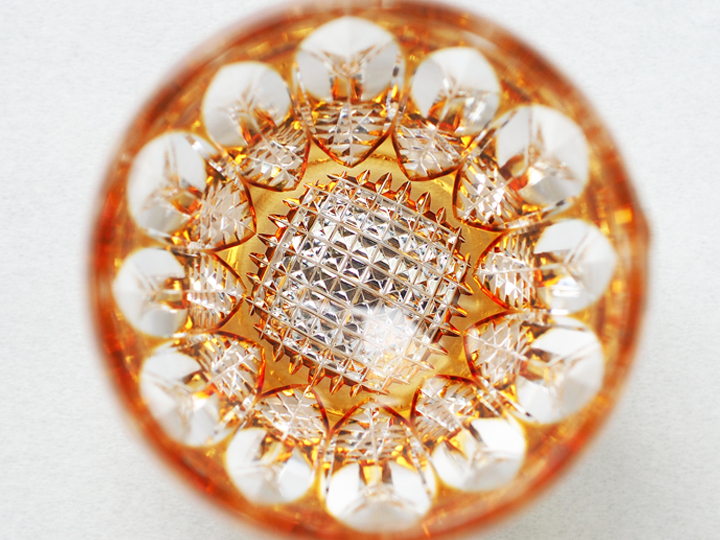 上から覗き込むと複雑に光が反射され、まるで万華鏡のような美しさです。底面に咲いた一輪の花のようで綺麗ですね。