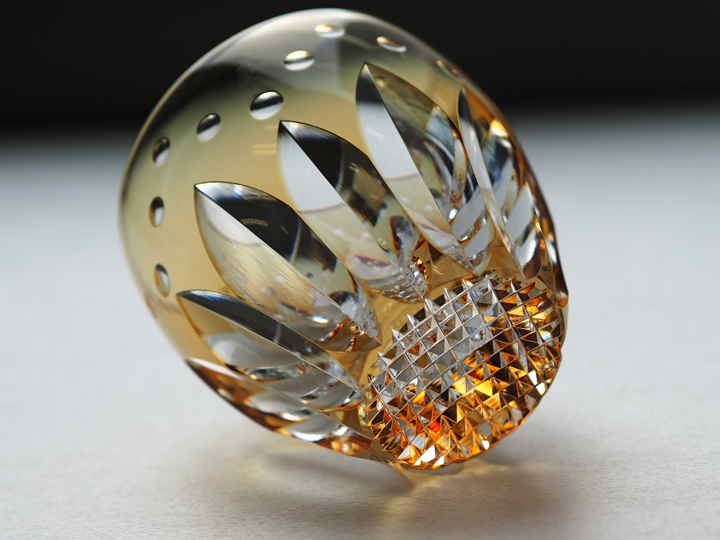 クリスタルガラスならではの高い屈折率と、色被せによる青色のグラデーションとの調和が涼しげな空気を醸し出しています。