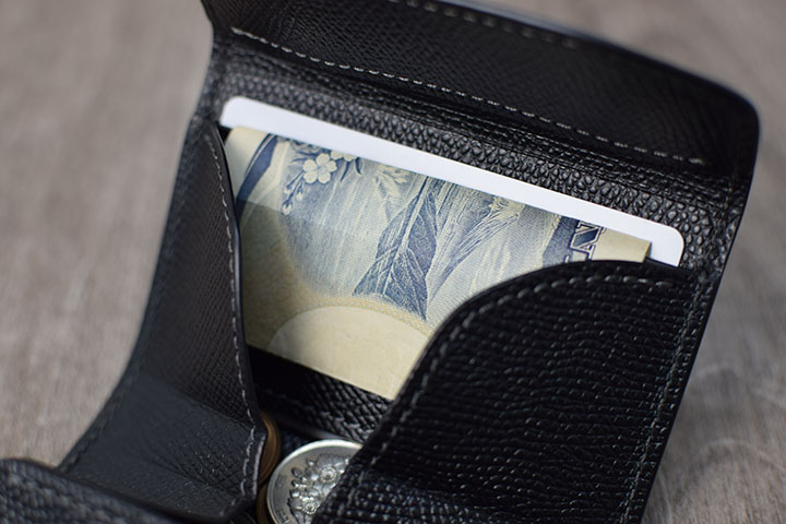 メインとなる収納部には革の仕切りが付いているので、仕切りの手前にコイン、奥にカードまたは緊急用に折り畳んだ紙幣を入れて仕分けができます。