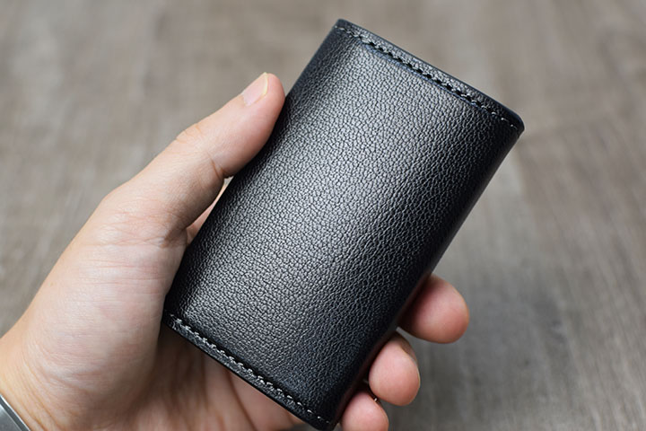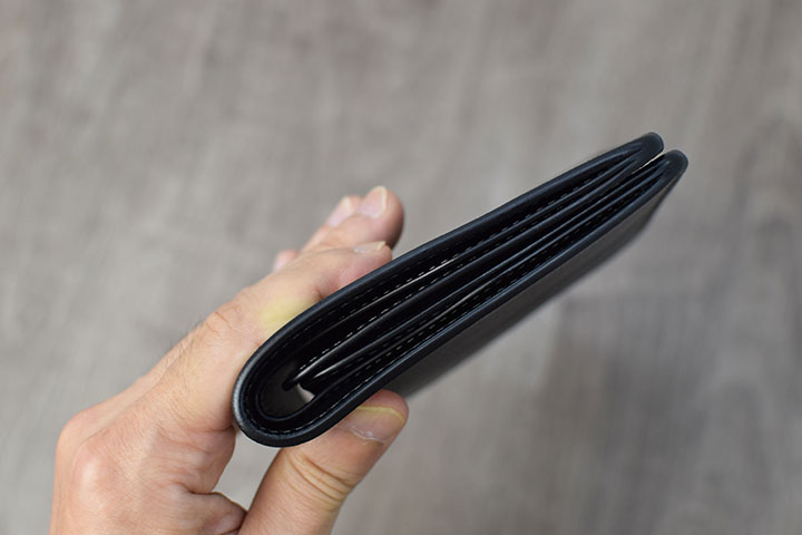 また、コインケースが付属しない分だけ、ある程度収納してもスリムですっきりとした厚みです。