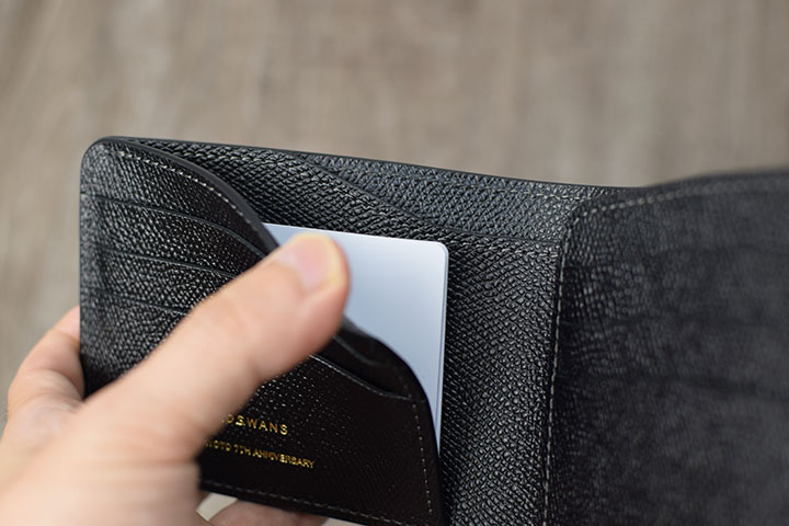 2辺綴じのカード収納に、落下を心配されるかもしれませんが、内装の型押しサドルプルアップは十分なハリ感が備わっているため、余程のことがなければ、カードが落下することはありません。