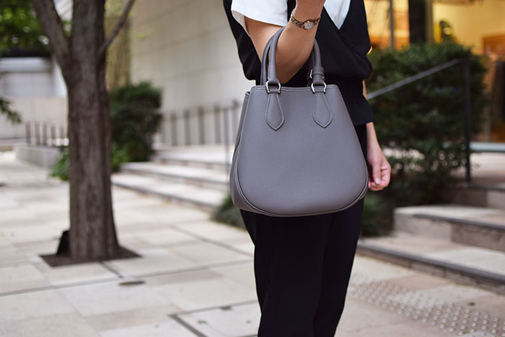 コンフェチュより少しカジュアルなイメージのプティトートはコロンとした丸いフォルムですが、シュランケンカーフの質感も相まって女性らしく上品なバッグに仕上げています。