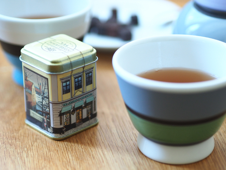 お店の屋根にあたる缶の蓋を開けますと、たちまち甘く芳醇な香りがフワッと立ち上がります。気分転換をしたい時やリラックスしたい時などは、もうこれだけで幸福な気分に浸れます。お茶を淹れる前の、何ものにも代え難い至福の時間です。