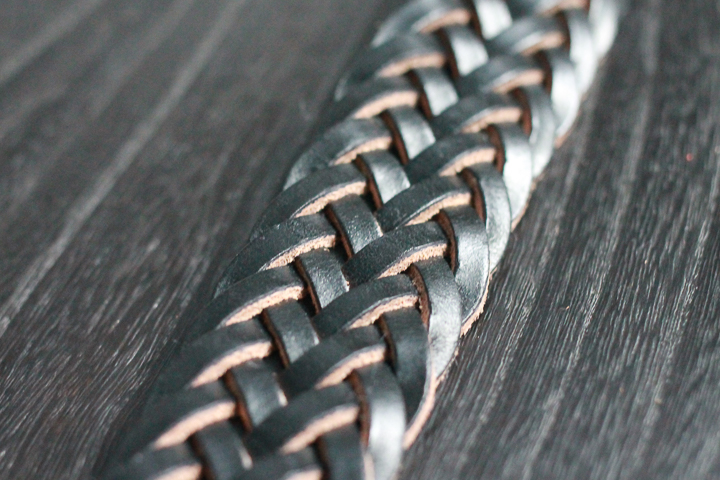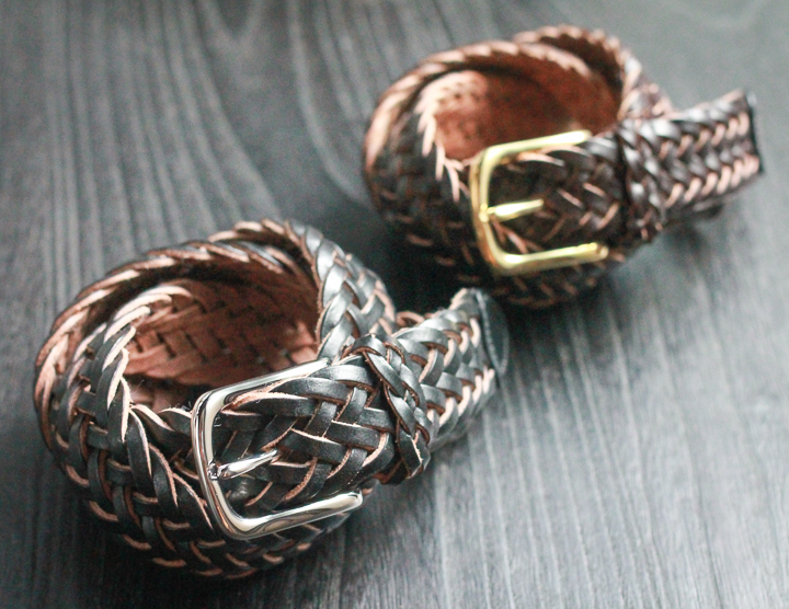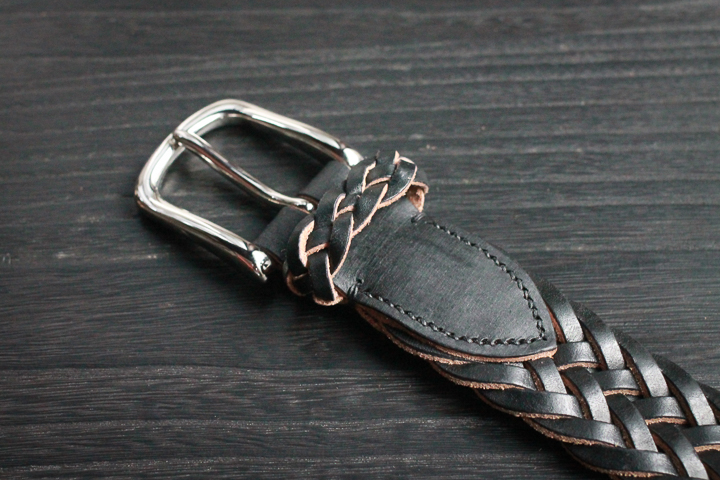 ベルト部分は9本のレース状にした革を一目ずつ編み込んで製作されております。