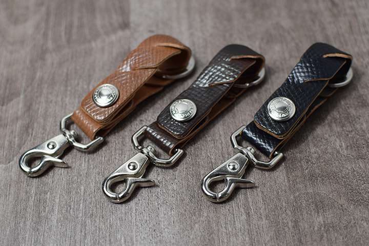 従来からスムースのシェルコードバンでBRAIDを製作しておりましたが、今回型押しのシェルコードバンになったことで強いハリ感が備わり、これまでのBRAIDとは趣の異なるキーホルダーとなりました。