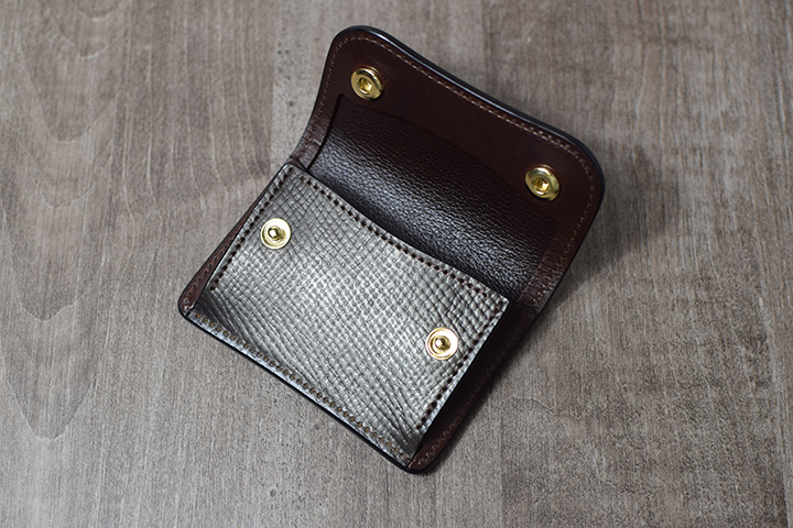 ゴールドカラーのホックを外すとホーウィン・シェルコードバンRUSSIA/HATCHを使用したコインケースの前胴部分が現れます。