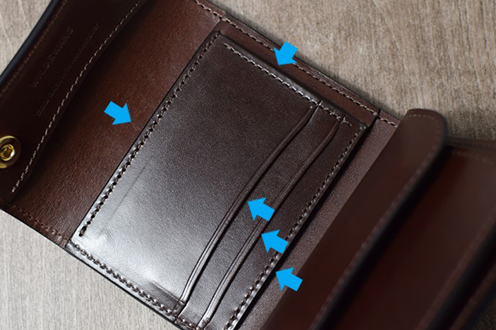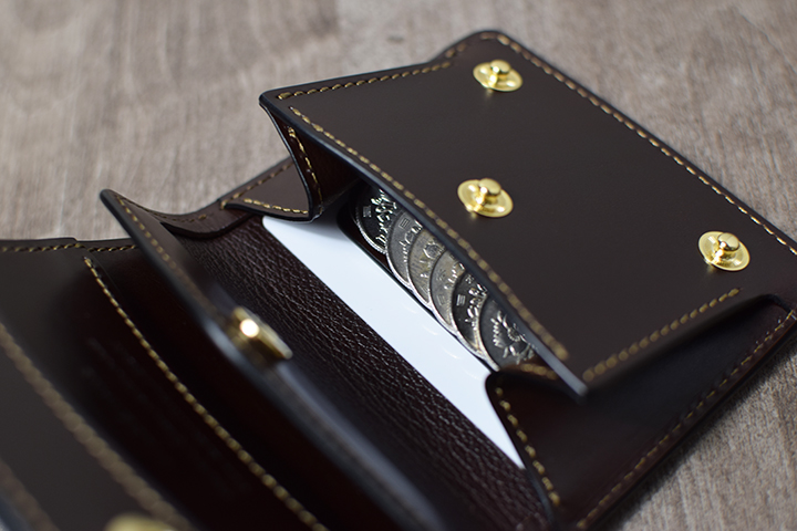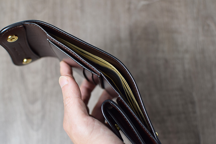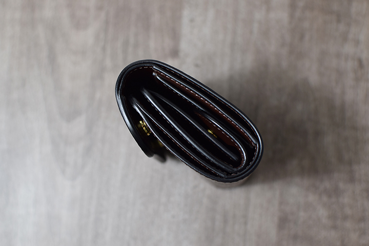 こちらにも革の仕切りが付いているので、手前にコイン、奥にカードが収まります。