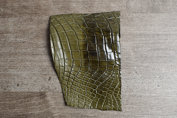 クロコダイルの背中で割いて腹の部分を使用する「バックカット(背割り)」にて裁断されたポロサスは、他のクロコダイルに比べて斑が細かく大きさも比較的均一です。