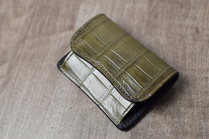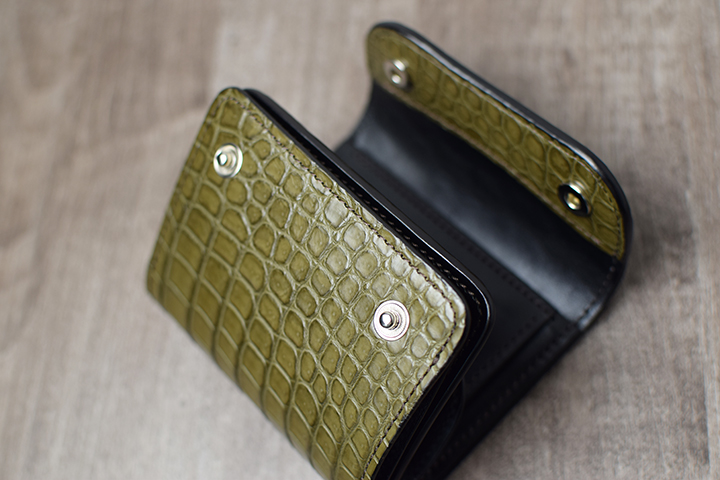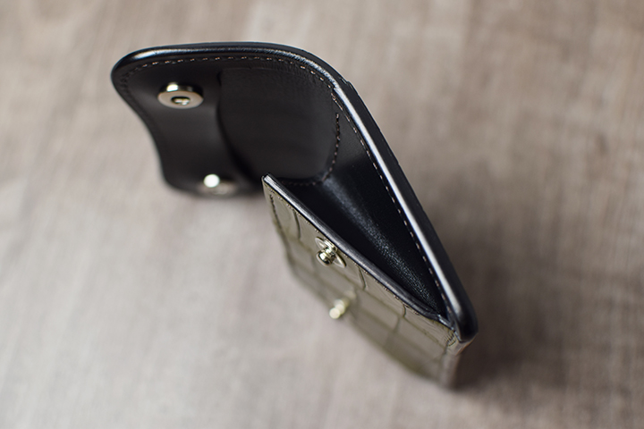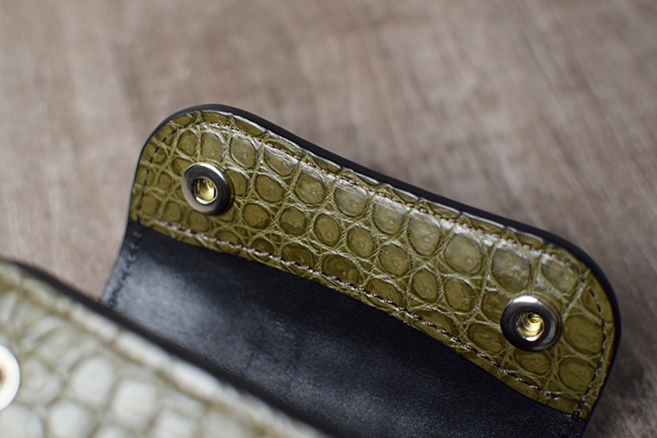 前胴にカーキのポロサスを用いたコインケースはたっぷりのコインが収納できる他、TONGUEと同様に内部に革の仕切りを設けているので、こちらにもカードを収納して頂けます。