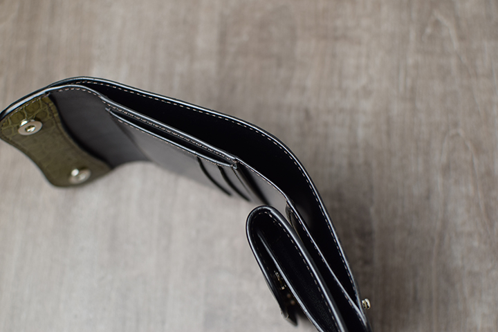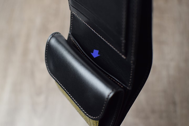 前胴革の手前と一番奥はマチなしのスペースで紙幣や領収書などの収納に適しています。