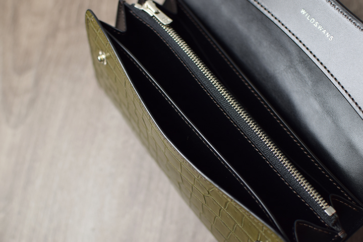 定番品のクロコダイルを用いたTONGUEはフラップと背面のカードポケットだけにクロコダイルが使われていますが、今回のポロサスTONGUEではフラップを開けた前胴部分にもポロサスが用いられるとても贅沢な仕様です。