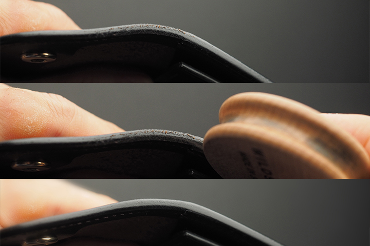 もちろん、木製の丸いお手入れ道具、「スリッカー」のみでもコバのお手入れに十分な効果を発揮致します。摩擦熱が起きる程度の強い力を加えながら、コバの部分を素早くこすります。コバに触れた時に、温かく感じられる位が目安となります。繊維が寝て引き締まることで滑らかな状態に近づきます。スリッカーでのお手入れは必ずしも行っていただく必要はございませんが、指の腹で撫でて頂いた時、ざらつきやへこみなどがお気になる場合にご使用下さいませ。難しいお手入れでなく、日常的にご自身でもおこなっていただきやすい仕上げを施している事が、長く良い状態で、ご愛用頂ける秘訣のひとつでございます。