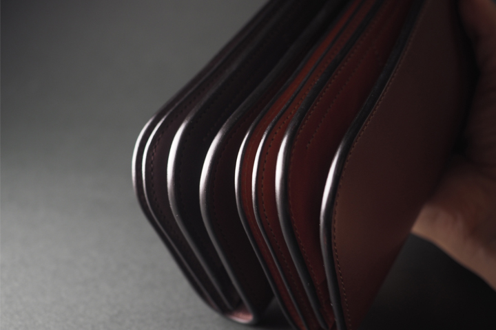 比較的、濃いお色味の製品には黒いコバを採用しています。黒々と確かな光沢を放つこの表情は染料で仕上げられています。顔料などで覆って仕上げているのではなく、革にじわじわと馴染んでゆく染料仕上げですので、衝撃を受けたり経年変化しても、欠け落ちてしまったり、染色部分が剥離してしまう心配がありません。そのため、外観を損なわず長くご使用いただく事ができます。