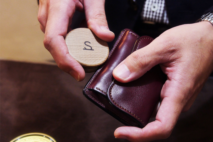 製品表面の皮革のお手入れはさることながら、コバもお手入れを加えることで、顕著に応えてくれます。使い込んでいただいたお品物ほど、お手入れ後の滑らかさが癖になってしまうかも知れません。殆どの革小物に付属しているスリッカーは、お客様にお気軽にご自宅でもコバのお手入れをしていただけます様ご用意しておりますが、詳細なご使用方法や、頻度に関してのご質問をお受けすることも少なくありません。上記のような要領でご自身でもお気軽に、コバのお手入れをお愉しみいただけますが、お近くにお越しの際は、是非一度、実際にご使用方法やお手入れの流れなどをご覧いただきながら、お客様の目で、手で、体感していただきたいと思います。