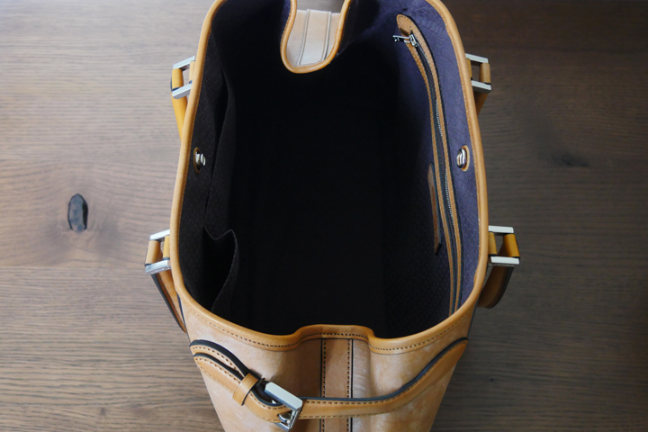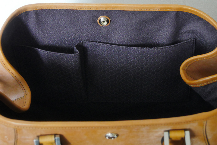 口元は大きく開く構造となっており、強度の高いホックでしっかりと留めて頂ける仕様となっております。オリジナルコットンで覆われた広々とした内装はザクザクお荷物を出し入れして頂ける1室構造でありますが、片側の側面にはファスナーポケットが付属されていますので、小物類など小さなお品物はこちらへしっかりと収納して頂けます。