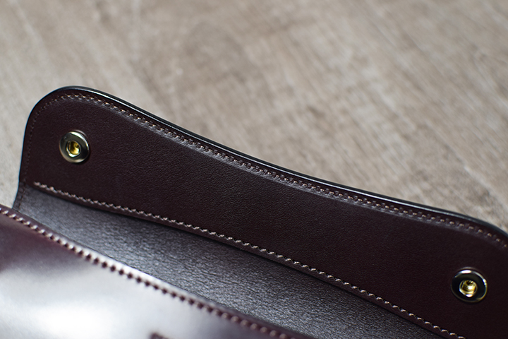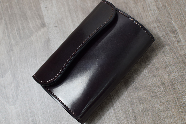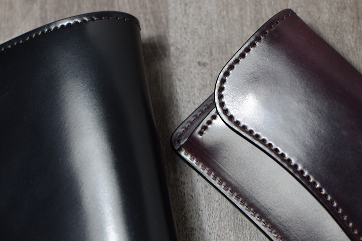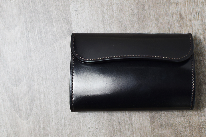前回ご紹介したENOを一回り大きくした三つ折り財布のBYRNEも長財布と二つ折り財布の中間に位置するアイテムです。繋ぎ目のない表の大きな板面部分が全てシェルコードバンです。