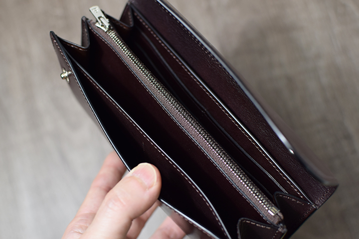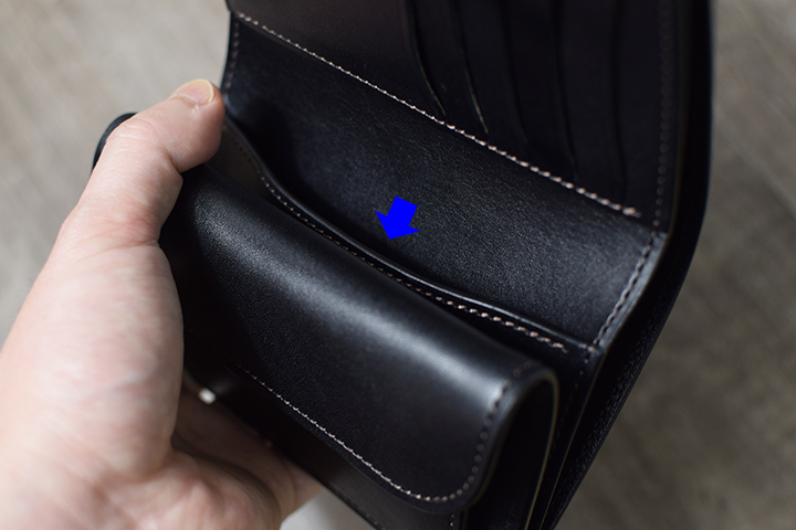 とても大きなコインケースですが、片マチ式でスムーズな出し入れを実現しています。