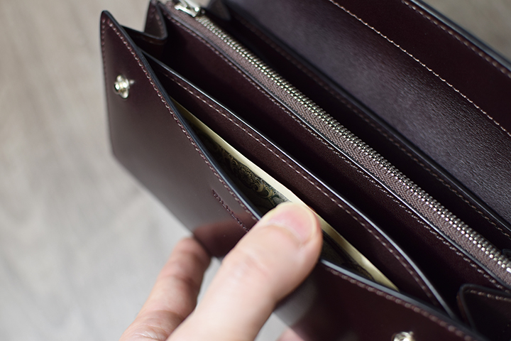 本体のサイドにある札室はその高さが少し深くなりますが、開口部が大きく開き、札室内部も革張りが施された仕様のため、視認性を確保しながら取り出しがスムーズです。