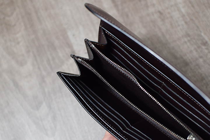 一番手前(前胴側)と一番奥(背胴側)はマチなしのスペースで、紙幣や領収書などの収納に適しています。