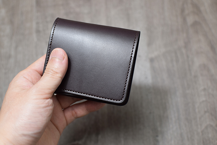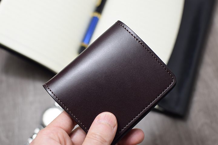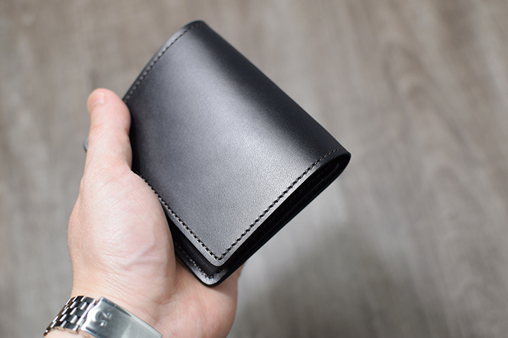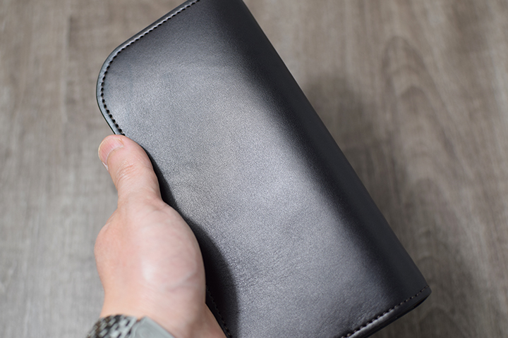 閉じた際の厚みは約25mmとなり、非常に肉厚でボリューム感のある長財布です。4層から成るWILDSWANS製品のなかでもとりわけ分厚いコバ(=革の断面)の連なりは圧倒的な存在感があります。