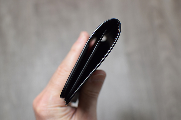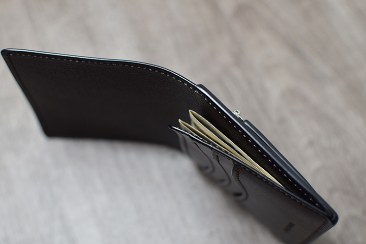 カード段の後ろはMORRISと同じ2辺をL字でなぞるように留めた「あおりポケット」です。そして、紙幣を入れることでこちらがそのまま札室となります。MORRISより多くの革のパーツ用いているため、より強力なホールド力が備わっています。